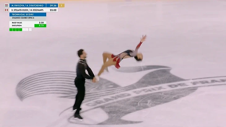 ● В финальном варианте сальто назад превратилось в сальто с поддержкой партнера: Дешам держит партнершу за конек, она отталкивается от его рук и делает кувырок назад. Идею подсмотрели в соцсетях.