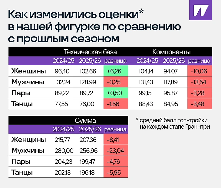 Сразу важно проговорить: это не связано с качеством фигуристов и их распределением по этапам. Да, у парней еще не выходили Евгений Семененко и Петр Гуменник, но и в прошлом сезоне на первых этапах Гран-при их баллы не были эталонными. А попавшие на подиум в этом году Александр Мельников (Красноярск) и Артур Даниелян (Казань) вполне эквивалентны прошлогодним призерам Даниилу Самсонову и Матвею Ветлугину.