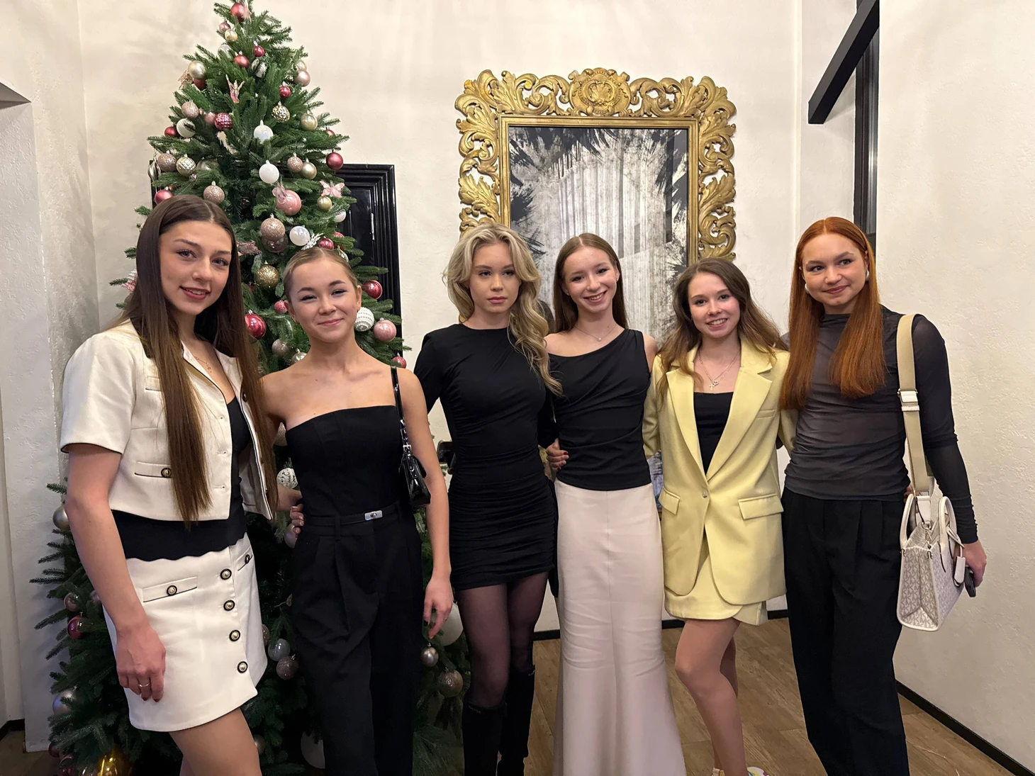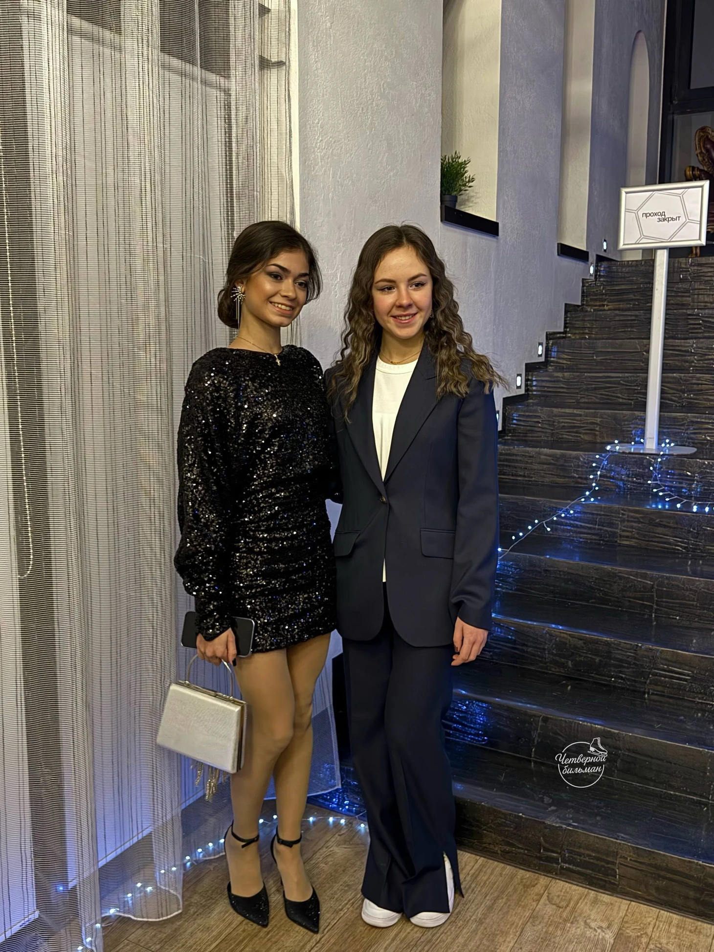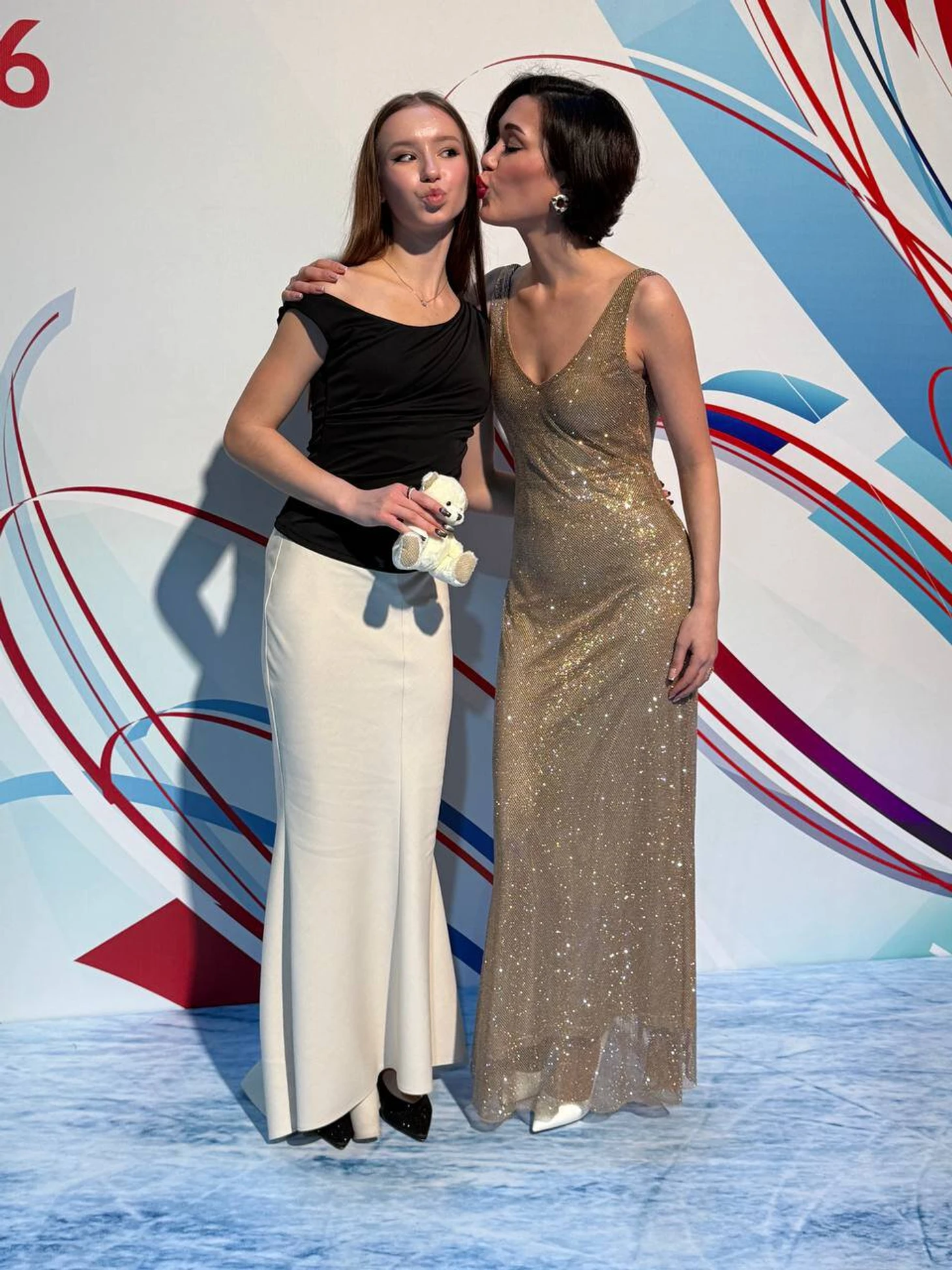 Дарья Садкова в черном топе со сборкой и юбке в пол, а тренер Елизавета Худайбердиева – в золотом платье.