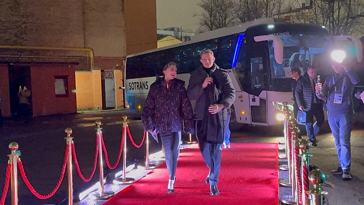 Перед главным входом расстелили красную дорожку. Должно было получиться торжественно, но спортсмены дефилировали в пуховиках и куртках – на улице пусть и нет снега, но температура +3 не располагает к открытым платьям уже на дорожке.