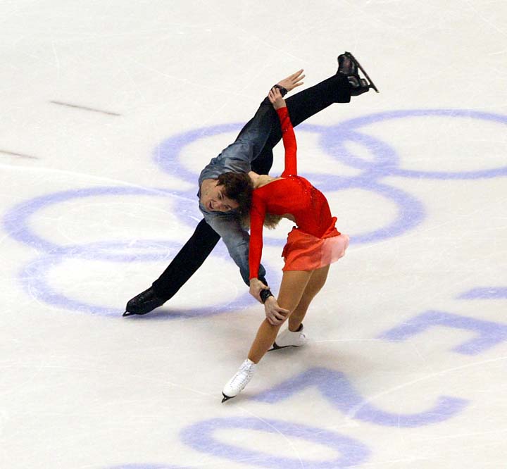 Начать хотелось бы с выступления Елены и Антона. Всегда все наши спортивные пары именно на Олимпийских играх находятся под сильнейшим давлением не только общественности, но и чиновников. Ведь продолжительное медальное господство на Играх не должно прерваться ни в коем случае. Тем более, что на предолимпийском чемпионате мира верх одержали Джеми Сале и Давид Пелетье - не так давно вставшие в пару под руководством Ришара Готье (нынешний тренер Дюамель и Рэдфорда). Причём, судьи им, ох, как благоволили. Если, кто не помнит - канадцы обошли россиян. К слову, на том турнире обе пары представляли свои самые лучшие постановки - "Историю любви" и "Чаплина". И "Чаплин" проиграл. Но это паражение не остановило Тамару Николаевну. Не смотря ни на что, она решила ехать в Солт именно с этой постановкой. Но, как рассказывала потом сама Москвина, специалисты порекомендовали программу заменить, так как в ней было слишком много элементов показательного номера. Конечно, это несправедливо: как так? Канадцы просто накатывают прошлогоднюю программу, а наши должны начинать работу с нуля.