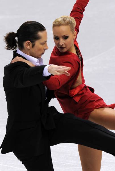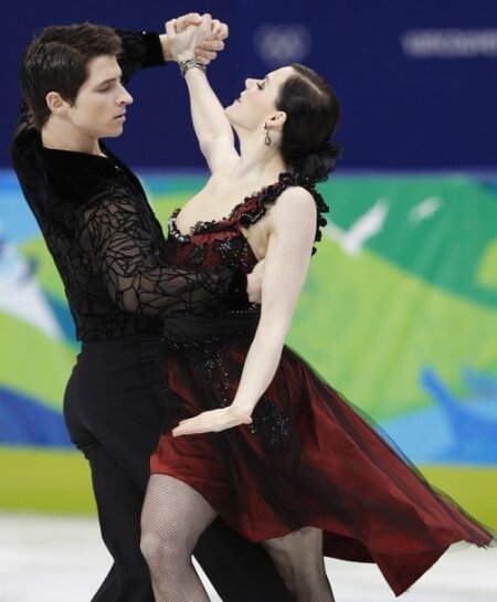 Вообще, мне кажется, Кантон на той Олимпиаде допустил в обязательном танце все возмозжные ошибки во внешнем виде, которые могут быть. Смотрите сами. Тут Вам и чёрно-красные платья, и розы в волосах (красная у Мэрил, чёрная у Тессы), и колготки в сетку, и бисер, и стеклярус, и каменья, и оборки, и бахрома, парни в блузах дизайна от девушки Сергея Воронова. И, конечно же, стрррррррррррррасть! Куда без неё? Танго же всё-таки нынче в Ванкувере.