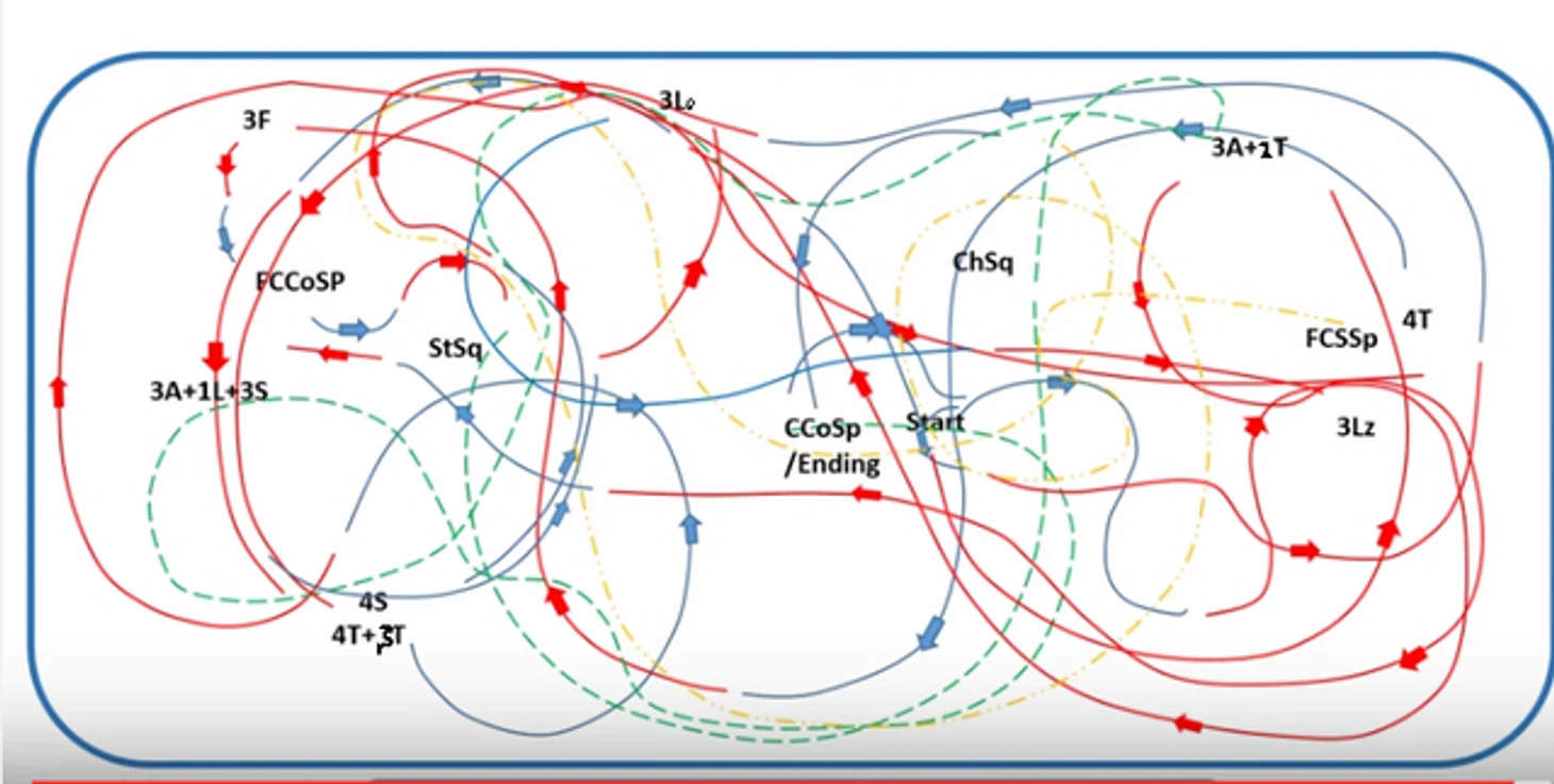 Рисунок программы разнообразный, покрытие льда хорошее. Зеленые линии обозначают дорожку шагов, которая охватывает всю площадь катка (вдоль длинного борта). Программа также имеет сложный рисунок хореодорожки (желтый пунктир). Фигурист использует разнонаправленное катание (соотношение красных и синих линий), что отражено в оценке за SS и TR. Ханю мало катит вдоль бортов и рисунок его программы имеет равномерное распределение всех элементов по площади катка.