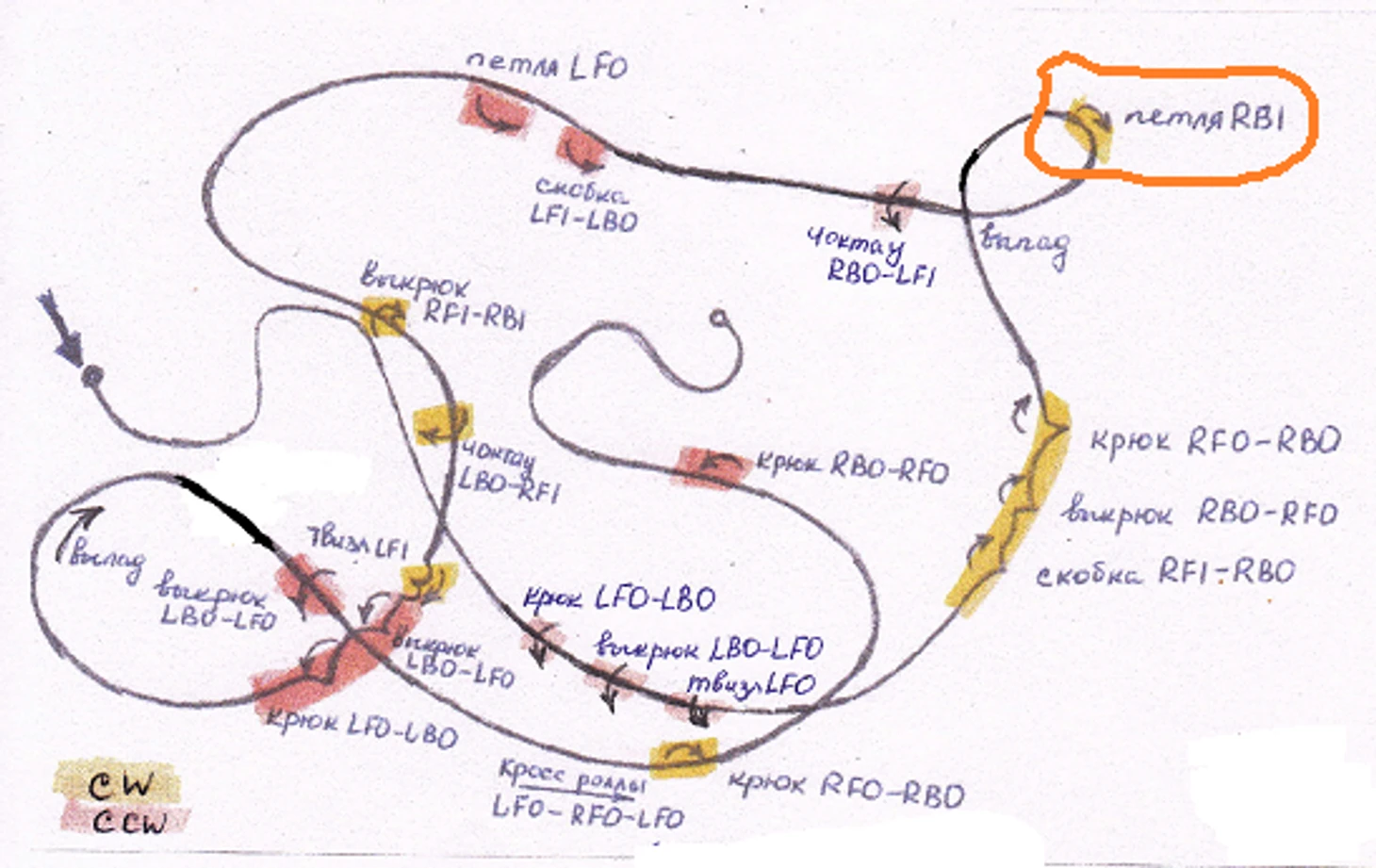 Кораблик наружу, крюк RFO-RBO, шассе, тройка RBO-RFI, моухок RFI-LBI, шассе RBO - 3А+2Т.