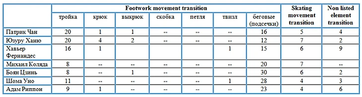 С учетом всех критериев компонента Transition/Linking Footwork (сложности связок перед элементами и между ними, их плотности, трудности и разнообразия) самую сложную программу представил Юзуру Ханю. Далее идут программы Хавьера Фернандеса и Патрика Чана.