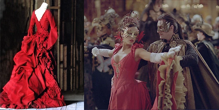 Говоря о костюмах американцев к ПП сразу хочу сказать огромнейшее спасибо, что пара не выглядит будто с костюмированной вечеринки по мотивам ПО. Спасибо, что избавили нас от «удовольствия» любоваться на n-ю реплику того самого платья из фильма – с корсетом под грудь и спадающей бретелькой! Спасибо, что не было никакого половинчатого черно-белого креатива и аппликаций масок. Пара выбрала не самую распространенную версию исполнения этой композиции и костюмы так же не были «в лоб». У платья Тары прекрасный цвет – эффект наложения тканей разных оттенков. Есть и намек на тот самый корсет – но это лишь намек, обыгранный с помощью отделки. В серебристых тесемках и бантиках на бретельках мне видится бельевой стиль минувшей эпохи. Так что ставлю на сцену, когда Кристина из гримерки попадает к призраку.