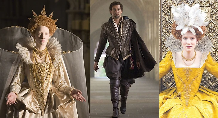 На платье Алексы всего одна яркая делать –роскошная золотая отделка в форме перевернутого треугольника. В ней сразу читается одна из отличительных черт женского костюма периода Елизаветы Тюдор: