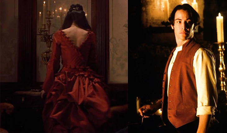Даму графа Дракулы традиционно одевают в кровавые оттенки. Хорошо, что для Тани выбрали бордовый – он выглядит благородней, чем ярко-красный и ей идет. Просто замечательное платье викторианского силуэта! Юбка со шлейфом и турнюром выглядит очень в духе времени и эффектно в движении. Закрытость платья, минимализм в отделке добавляют образу еще больше благородства и Татьяна выглядит настоящей леди. Оформление верха платья и спины (лацканы и кружево в вырезе) навеяло ассоциации с перевернутым пиджаком Оксаны Домниной. Это единственный момент в этом наряде, который показался мне немного спорным. На мой вкус, платье не потеряло бы в впечатлении, если бы этой детали не было.