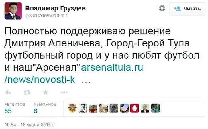 Город-Герой Тула – футбольный город, и у нас любят футбол и наш «Арсенал», – написал Груздев в своем твиттере