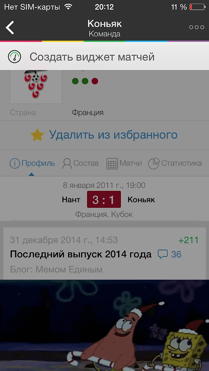 Чтобы создать виджет с матчами любимой команды, нажмите на кнопку в правом вехнем углу в профиле команды, а затем так же добавьте приложение на экране «Сегодня».