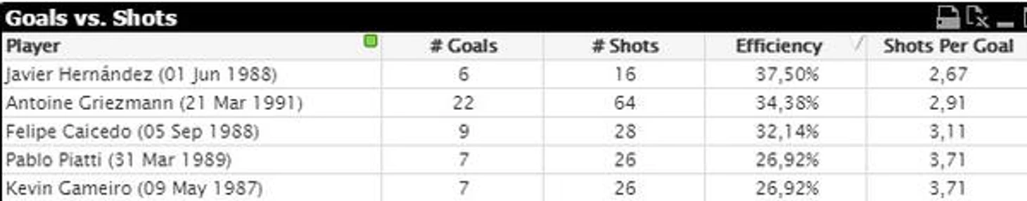 Наилучший показатель реализации у форварда «Реала» Хавьера Эрнандеса, который забил 6 мячей, нанеся 16 ударов по воротам (37,5% реализация, голевым в среднем становится каждый 2,67 удар мексиканца).