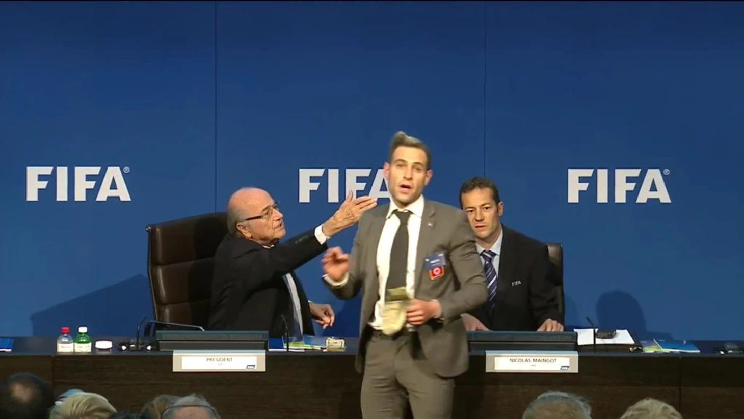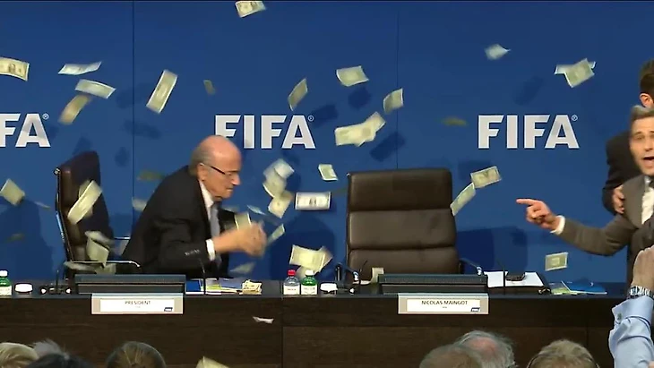 Британский комик закидал Блаттера деньгами на пресс-конференции ФИФА