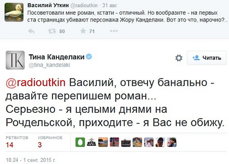 «Василий, отвечу банально: давайте перепишем роман. Серьезно. Я целыми днями на Рочдельской, приходите. Я Вас не обижу», – написала Канделаки в своем твиттере.