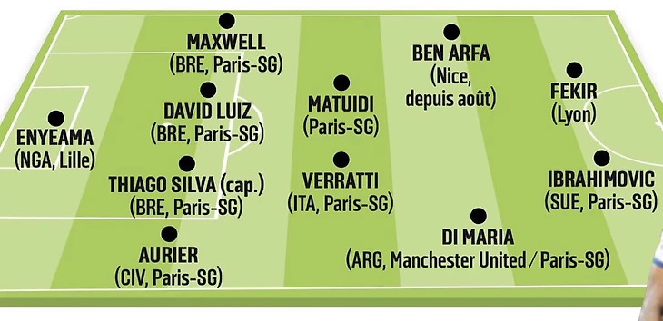В состав сборной попали следующие игроки: Винсент Эньема («Лилль»), Серж Орье, Давид Луиз, Тиаго Силва, Максвелл, Марко Верратти, Блез Матюиди, Анхель Ди Мария, Златан Ибрагимович (все – «ПСЖ»), Хатем Бен-Арфа («Ницца»), Фекир («Лион»).
