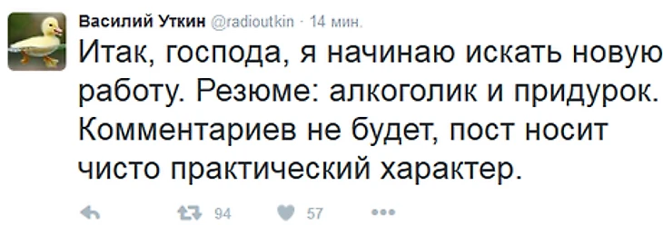 «Итак, господа, я начинаю искать новую работу. Резюме: алкоголик и придурок. Комментариев не будет, пост носит чисто практический характер», – написал Уткин в своем твиттере.