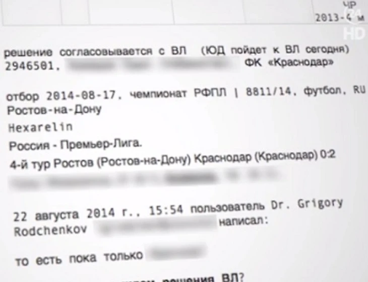 ARD демонстрирует фрагменты переписки экс-главы московской антидопинговой лаборатории Григория Родченкова, где фигурируют люди с инициалами ВЛ (вероятно, Виталий Леонтьевич Мутко) и ЮД (вероятно, Юрий Дмитриевич Нагорных), причем решение согласовывается с «ВЛ».