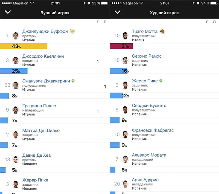 В голосовании за лучшего игрока матча Италия – Испания #прямосейчас лидирует Джанлуиджи Буффон, не пропустивший ни одного мяча. Худший – Тиаго Мотта, едва не получивший красную карточку после выхода на замену.