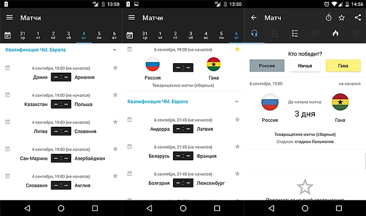В ближайшие дни пройдут первые матчи квалификации Чемпионата Мира 2018, а Россия сыграет товарищеский матч с Ганой. Приложение Scores & Video – самый удобный способ следить за официальными и товарищескими матчами сборных, смотреть видео голов, обсуждать матчи и изучать футбольную статистику.
