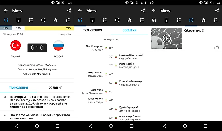 – Нет возможности посмотреть матч на стадионе или по телевизору? Не беда! Следите за ходом игры с помощью подробной текстовой трансляции и смотрите видео голов и опасных моментов;