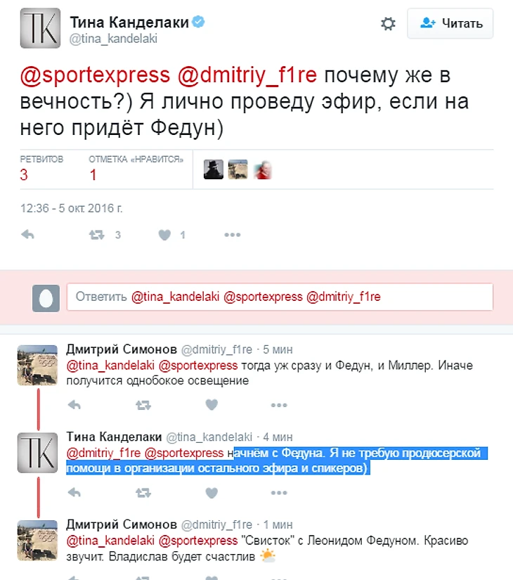 «Почему же в вечность? Я лично проведу эфир, если на него придет Федун. Начнем с Федуна. Я не требую продюсерской помощи в организации остального эфира и спикеров», – написала Канделаки в социальной сети Twitter.