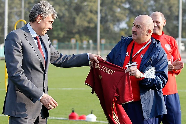 Главный тренер сборной России Станислав Черчесов вручил владельцу и президенту «Краснодара» Сергею Галицкому футболку национальной команды.
