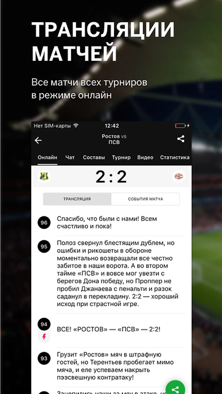 – Возможность выбора любимых видов спорта, турниров и команд;– Онлайн трансляции матчей, составы и расстановки;