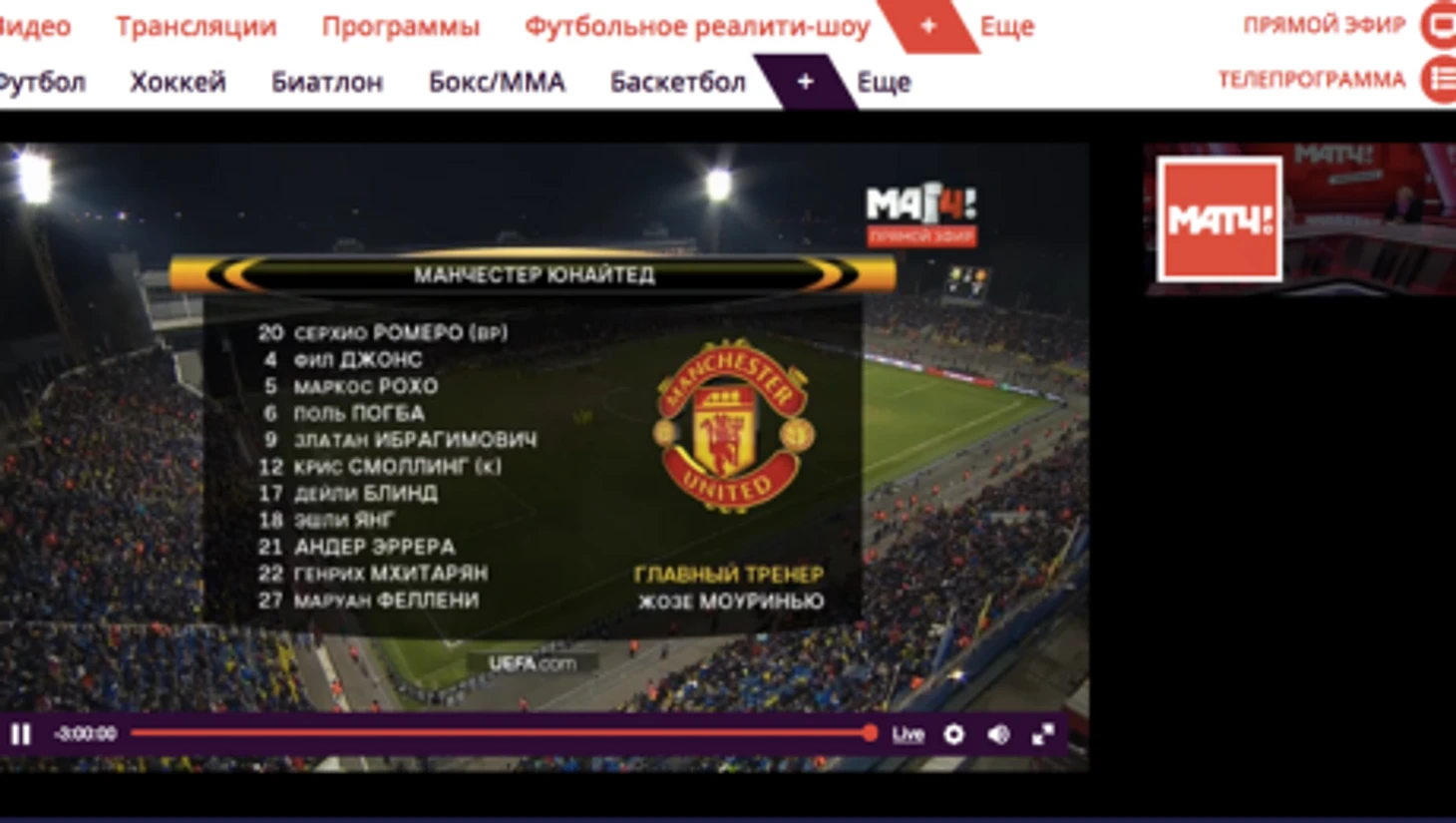 «Матч ТВ» допустил ошибку при показе стартовых составов команд перед началом матча 1/8 финала Лиги Европы «Ростов» – «Манчестер Юнайтед».