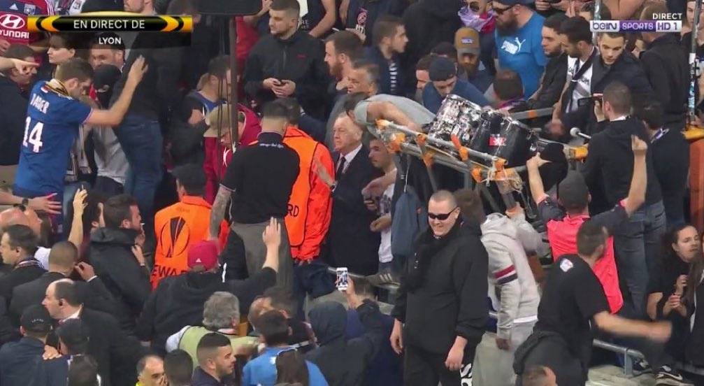Сообщается, что один стюард получил повреждения. Фанаты гостей продолжили бросать посторонние предметы и файеры с верхнего яруса, в результате чего болельщики французского клуба были вынуждены бежать на поле.