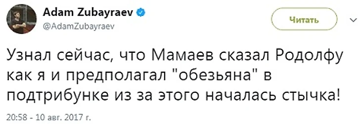«Узнал сейчас, что Мамаев сказал Родолфо, как я и предполагал, «обезьяна» в подтрибунке, из-за этого началась стычка!» – сообщил журналист Адам Зубайраев.