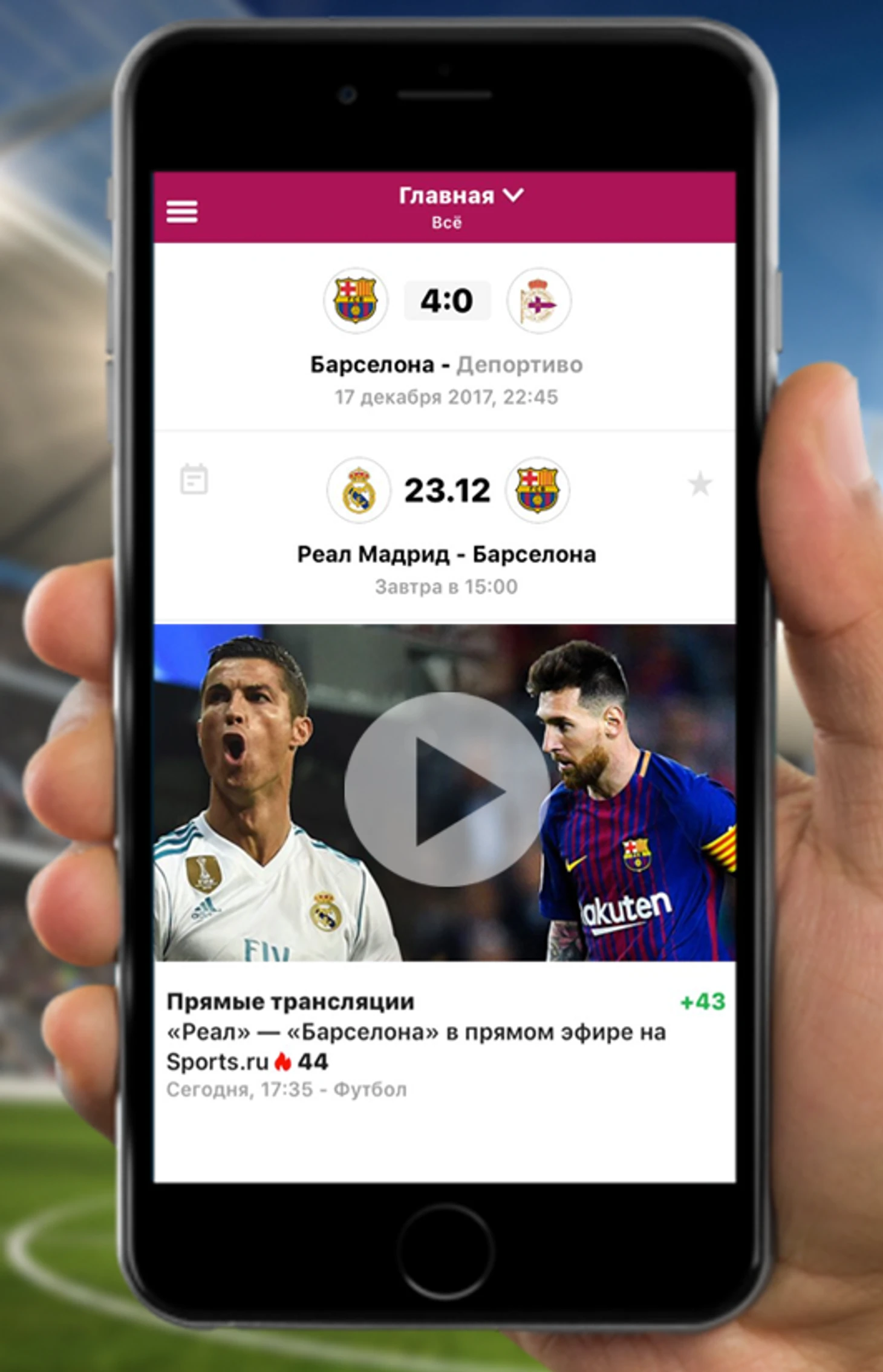 Вы сможете посмотреть трансляцию матча прямо на экране вашего телефона или планшета в высоком разрешении благодаря клубным приложениям «Реала» и «Барсы» от Sports.ru!