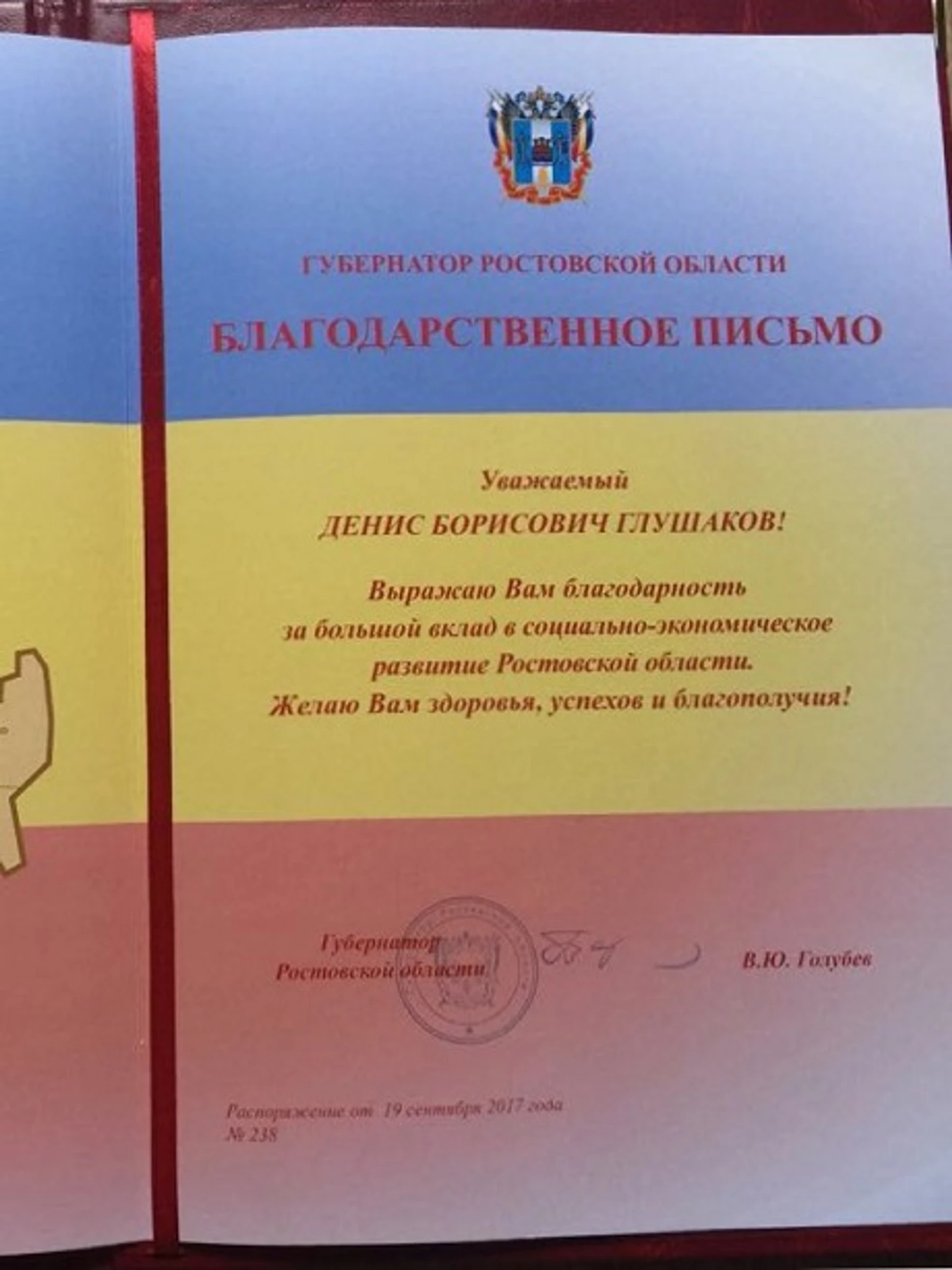 «Уважаемый Денис Борисович Глушаков! Выражаю Вам благодарность за большой вклад в социально-экономическое развитие Ростовской области. Желаю Вам здоровья, успехов и благополучия!» – сказано в тексте.