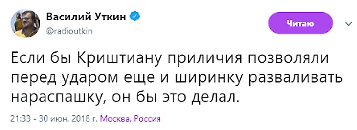«Если бы Криштиану приличия позволяли перед ударом еще и ширинку разваливать нараспашку, он бы это делал» – написал Уткин.