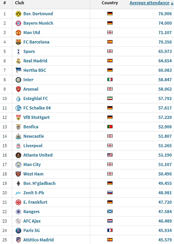 Самыми посещаемыми клубами на данный момент являются дортмундская «Боруссия» (76 906), «Бавария» (74 000) и «Манчестер Юнайтед» (71 107).