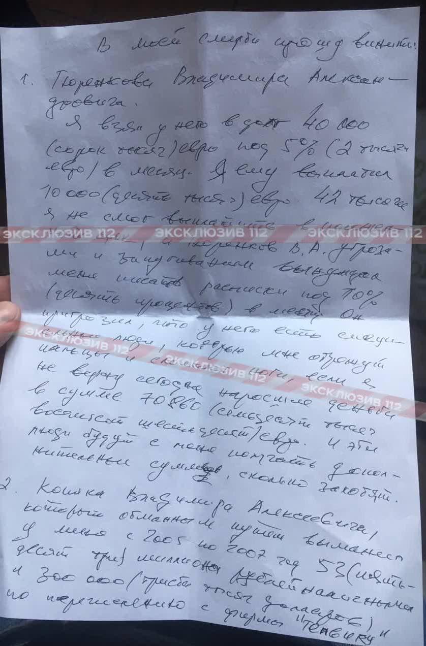 «В моей смерти прошу винить Тюренкова Владимира Александровича, которому я должен 70 860 евро, и который пригрозил сломать мне ноги и пальцы, если я не верну долг», – написал Рубин перед смертью.