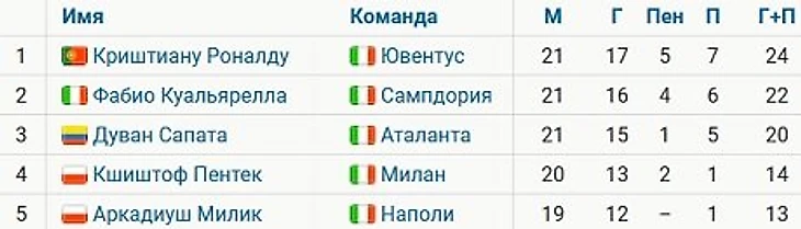 Роналду обогнал Дувана Сапату из «Аталанты» (15 голов в 21 матче) и Фабио Куальяреллу из «Сампдории» (16 голов в 21 игре) и вышел на первое место в списке бомбардиров.