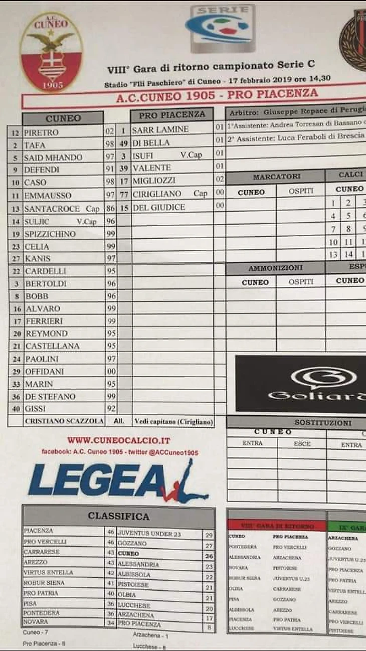 Первый тайм завершился со счетом 16:0, а за весь матч в составе «Кунео» 6 голов забил марокканский форвард Хишам Канис. В составе «Про Пьяченцы» с первых минут вышли лишь семь человек, по ходу матча, при счете 0:17 на 60-й минуте, на поле появился еще один футболист.