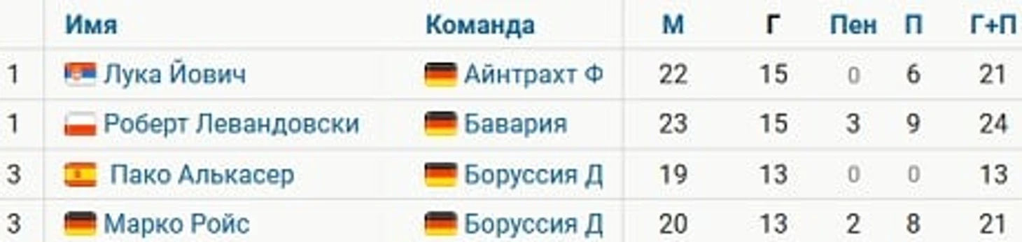 Левандовски делит первое место в списке бомбардиров с форвардом «Айнтрахта» Лукой Йовичем.