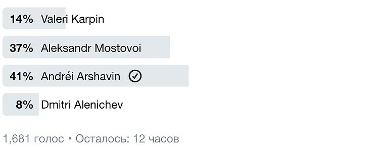 В голосовании на текущий момент приняли участие 1681 человек. Лидирует в опросе Андрей Аршавин.