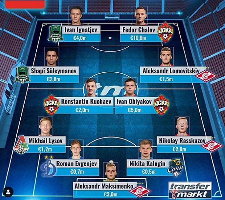 Немецкий сайт Transfermarkt, специализирующийся на оценке трансферной стоимости футболистов, опубликовал символическую сборную самых дорогих российских игроков в возрасте до 21 года.
