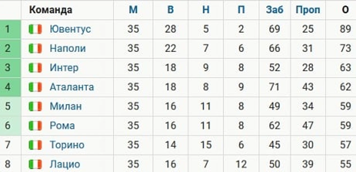 «Интер» (63 очка) и «Аталанта» (62) пока попадают в Лигу чемпионов. «Милан» (59), «Рома» (59), «Торино» (57) и «Лацио» (55) сохраняют шансы.