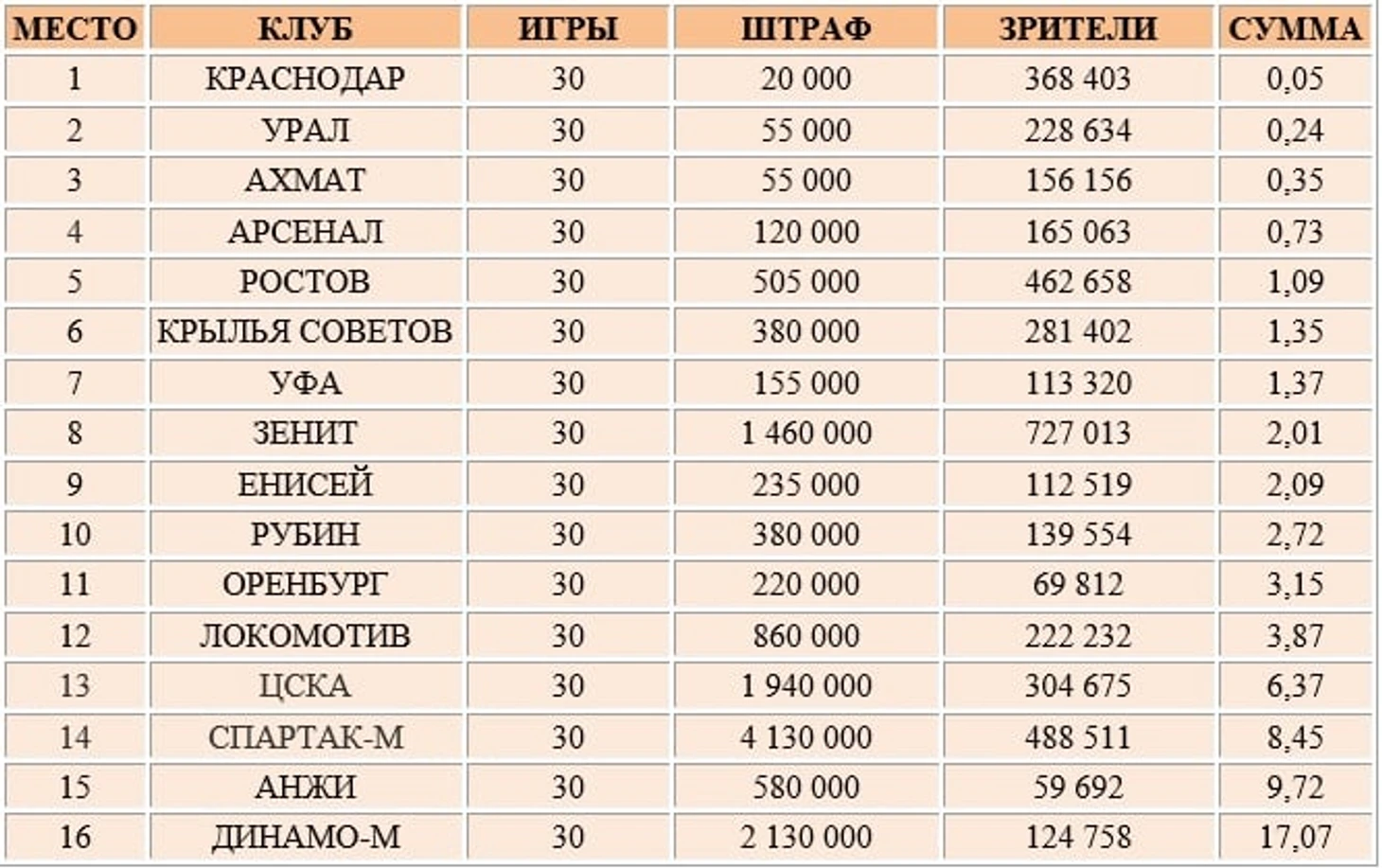 На втором месте «Урал» (55 тысяч рублей штрафов, 228 634 зрителя), третий – «Ахмат» (55 тысяч, 156 156 болельщиков).