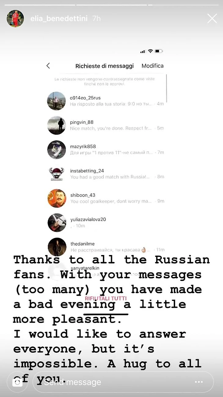 Я хотел бы ответить всем, но это невозможно. Обнимаю всех вас», — написал Бенедеттини в сторис инстаграма.