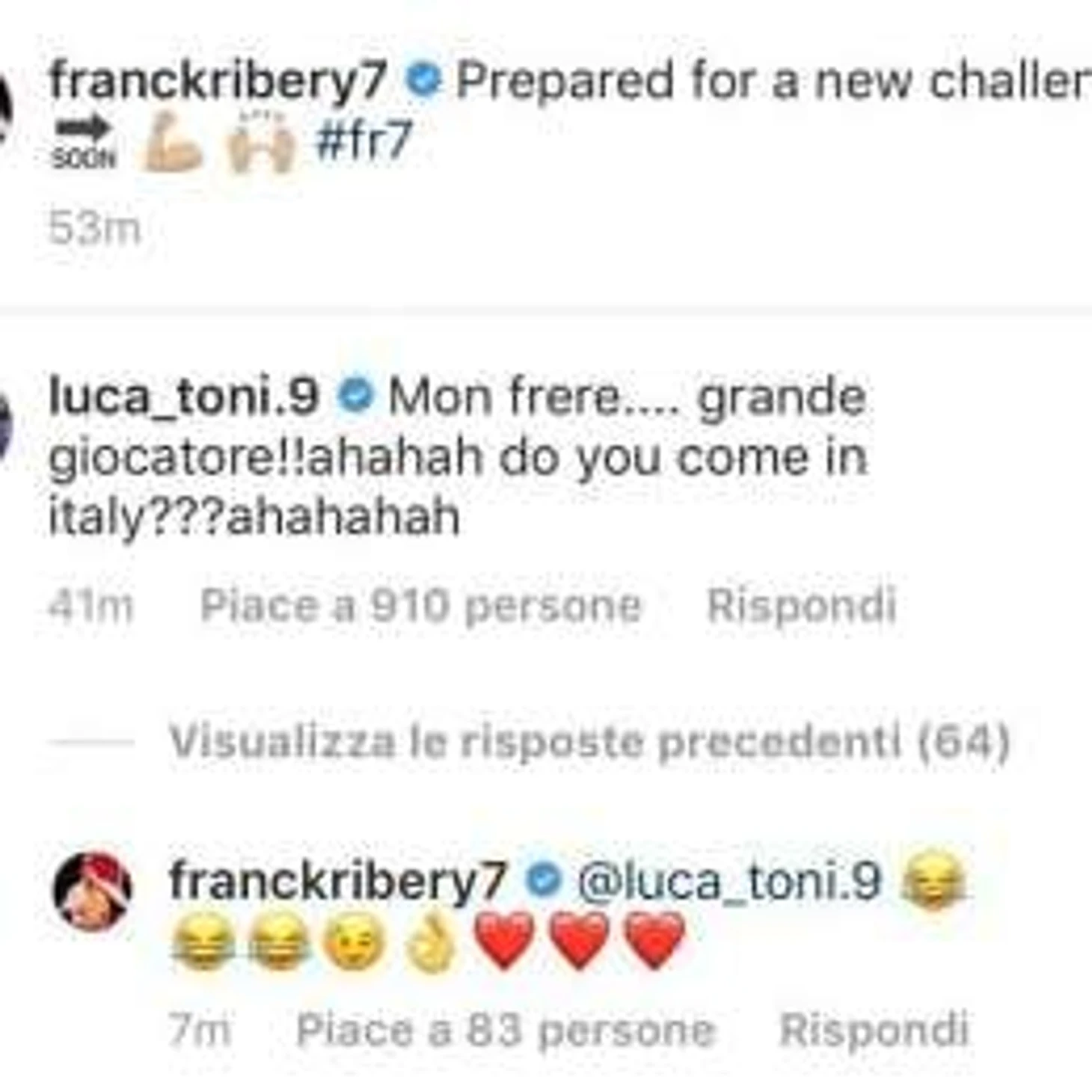 Лука Тони, бывший одноклубник Рибери по «Баварии», обратился к хавбеку в комментариях: «Братан… отличный игрок! Ты переезжаешь в Италию? Ахаха».