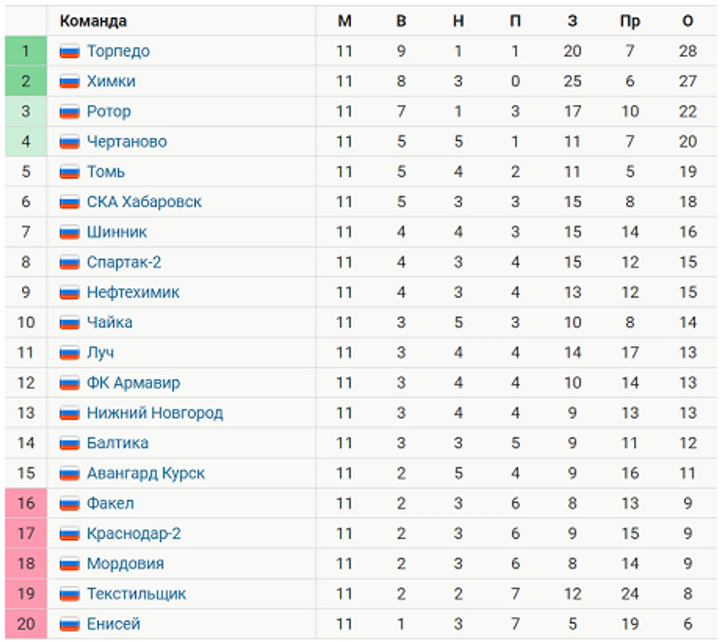 После 11 туров «Торпедо» набрало 28 очков и занимает 1-е место в ФНЛ.