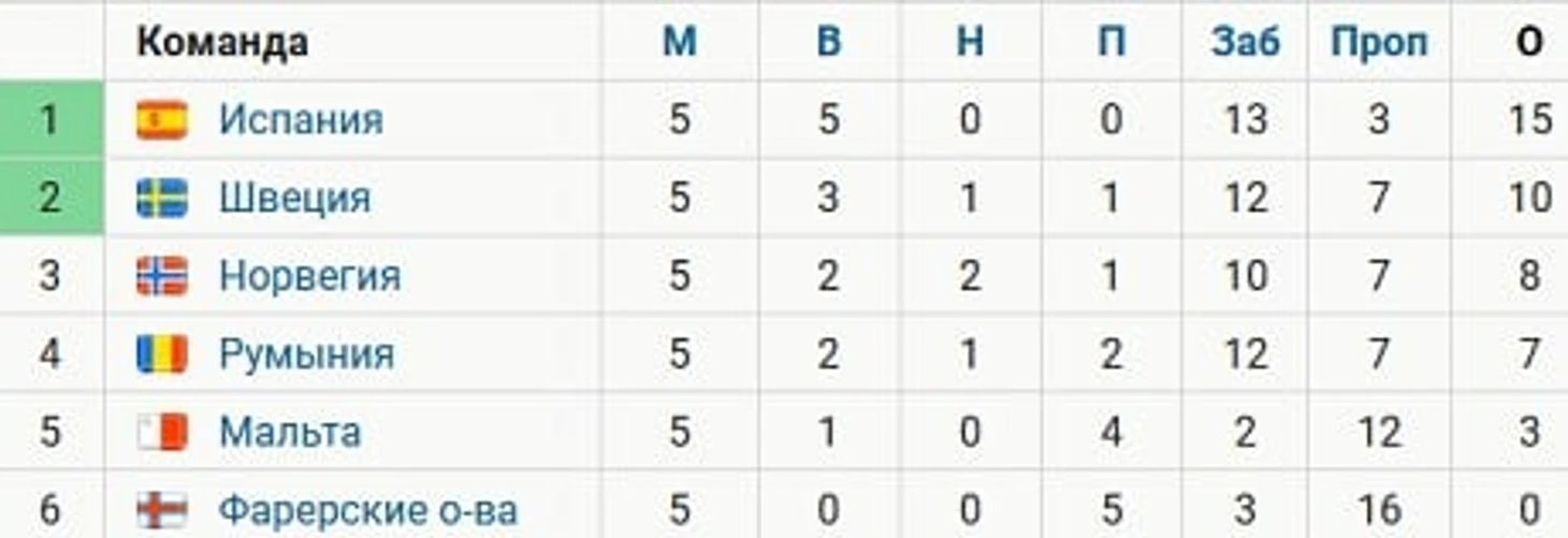 Испанцы выиграли все пять матчей в отборочном турнире к чемпионату Европы с общим счетом 13:3 и лидируют в группе F, набрав 15 очков.