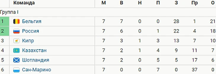 Команда Станислава Черчесова набрала 18 очков и занимает второе место в группе I, опережая сборную Кипра на 8 очков и отставая от команды Бельгии на 3.