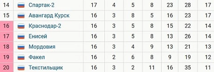 От зоны вылета «Спартак-2», занимающий 14-е место, отделяют 3 очка.