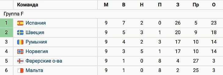 Лидирует в группе с 23 очками сборная Испании, которая досрочно обеспечила себе первое место.