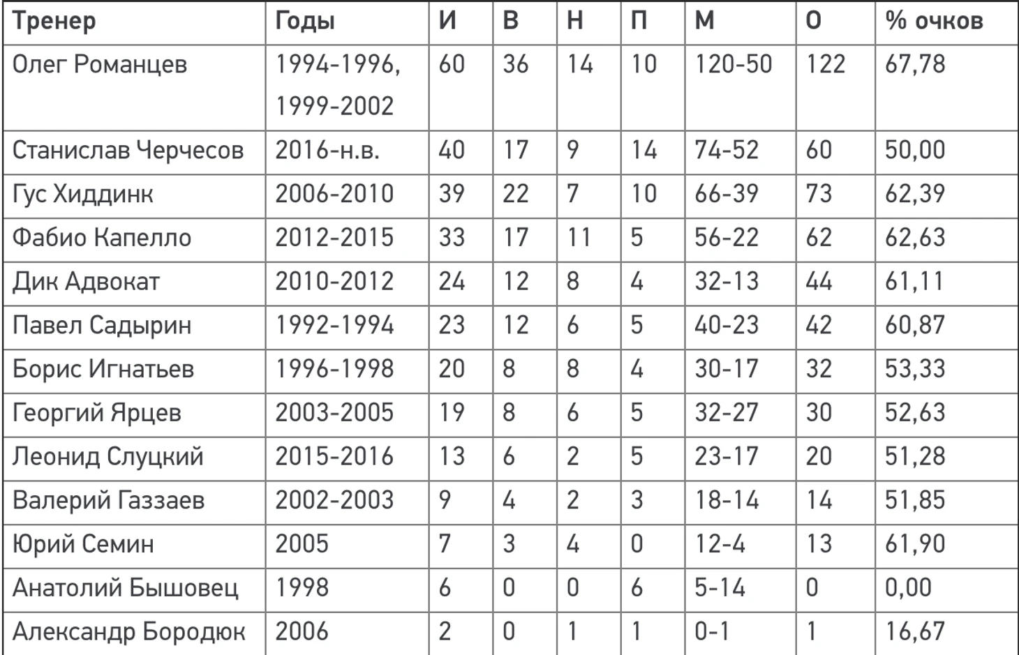 Черчесов уступает только Олегу Романцеву, под руководством которого команда провела 60 игр.