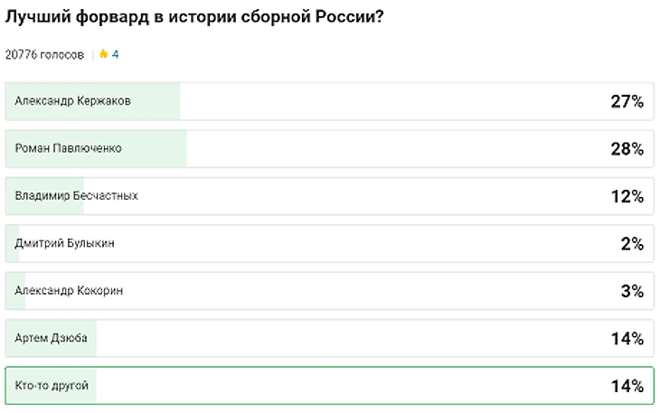 3% проголосовали за игрока «Зенита» Александра Кокорина, 2% - за бывшего форварда «Локомотива» и «Динамо» Дмитрия Булыкина.